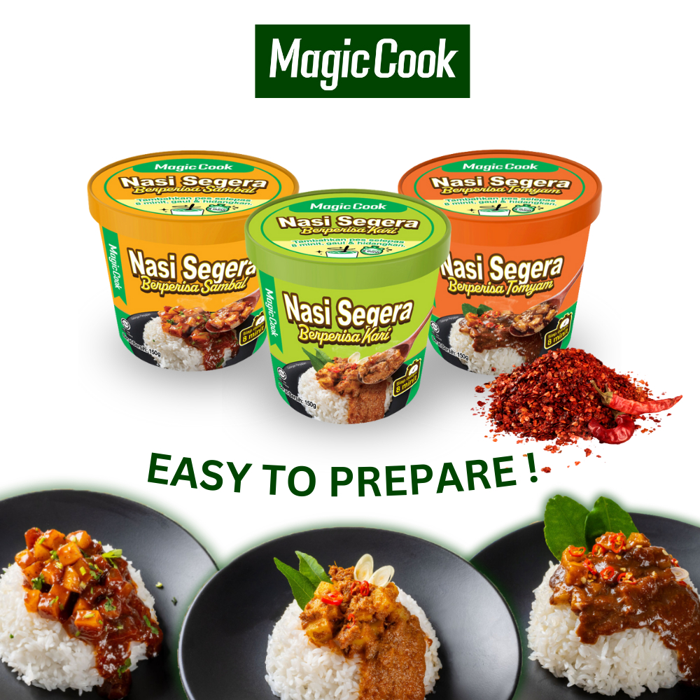 Magic Cook kini memperkenalkan inovasi terbaru dalam dunia makanan segera, dengan pelancaran Nasi Segera Berperisa Tomyam, Sambal, dan Kari. Produk ini direka untuk memenuhi keperluan pengguna yang mahukan hidangan lazat, pantas, dan mudah disediakan, khususnya bagi mereka yang sibuk atau sering dalam perjalanan.