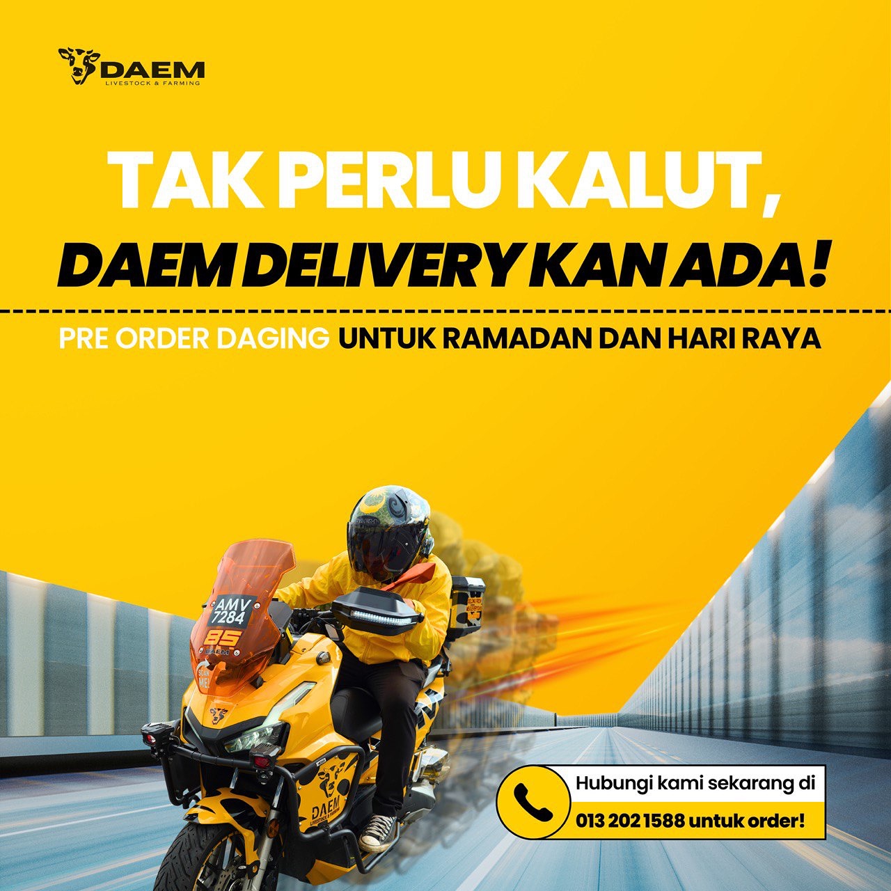 Pelanggan boleh membuat tempahan terus melalui WhatsApp di nombor +6013-2021588. Pasukan DAEM akan menguruskan pesanan, pemotongan dan penghantaran dengan pantas dan cekap.